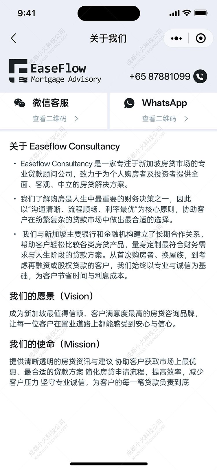 這是成都小火科技公司給新加坡Easeflow Consultancy房產(chǎn)企業(yè)開發(fā)的海外版微信(wechat)小程序。這套小程序是以房貸為核心,包含房貸計(jì)算,房貸額度申請(qǐng),房貸月供演示,房貸詳情查看等功能。