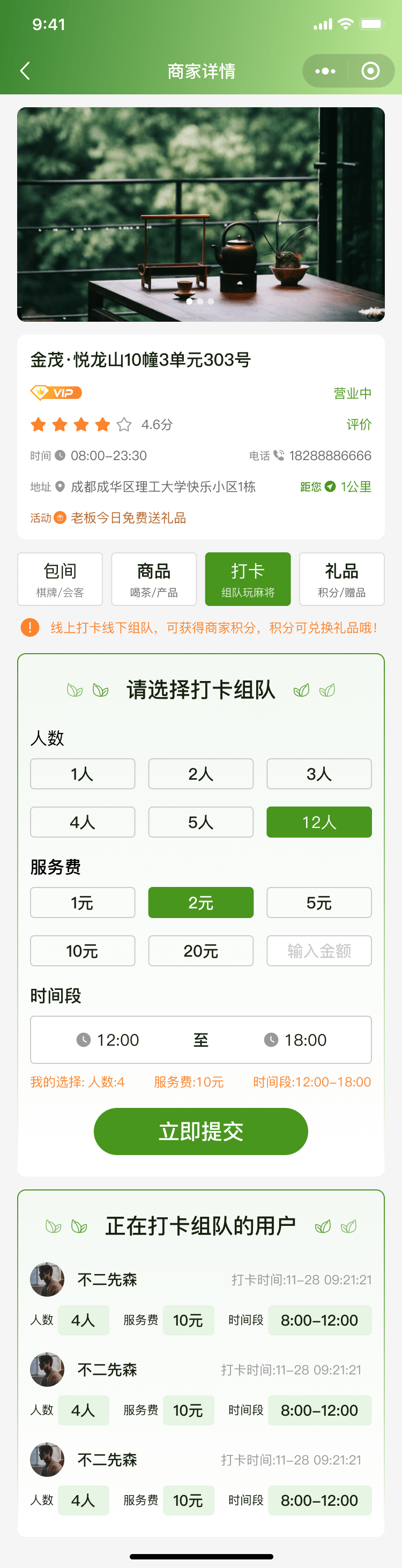 這款“約茶小程序”最具特色的功能之一是打卡組隊(duì)。用戶可以根據(jù)自己的需求選擇預(yù)約的人數(shù),并與其他預(yù)約用戶進(jìn)行隨機(jī)組合,形成一種類似于“組隊(duì)盲盒”的體驗(yàn)。這種設(shè)計(jì)既增加了用戶之間的互動樂趣,也提高了社交的隨機(jī)性和新鮮感。