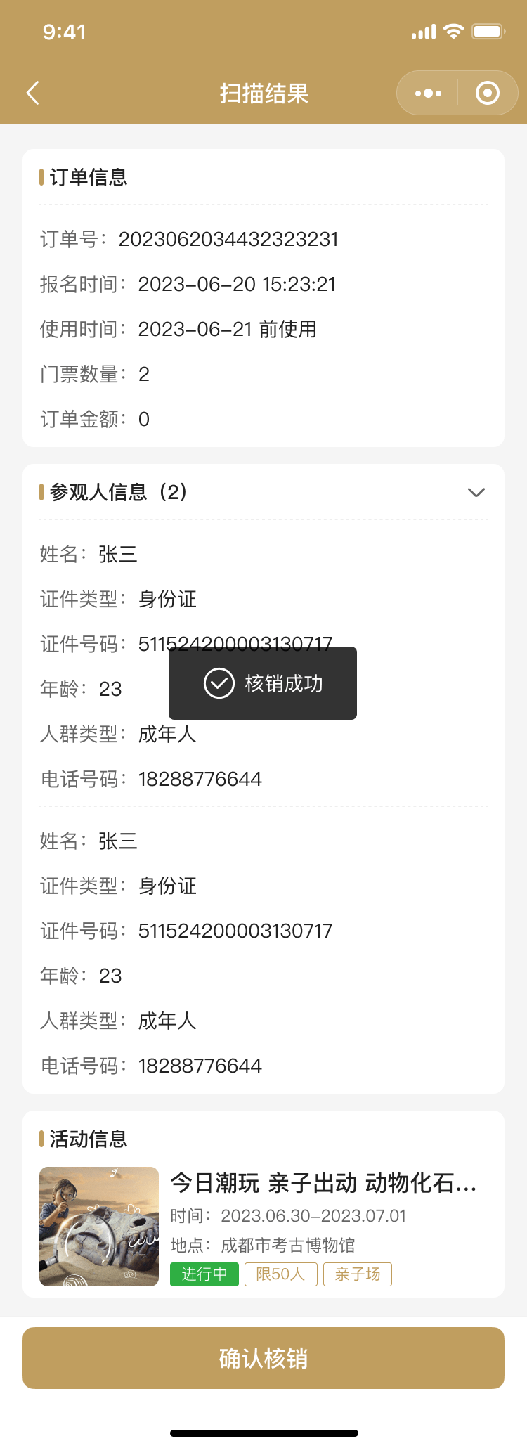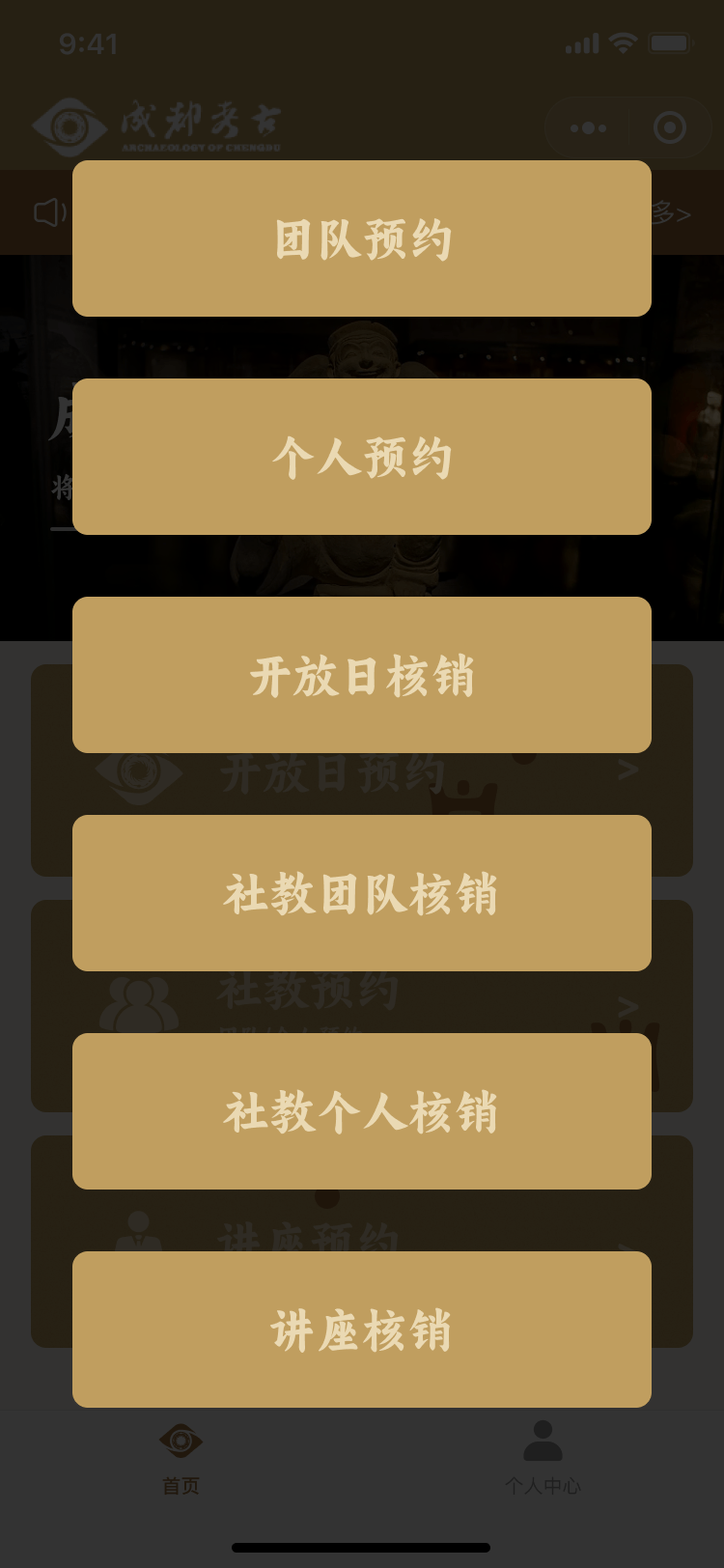 為了提高考古活動的組織和管理效率,小程序特別設(shè)計(jì)了開放日核銷、社教團(tuán)隊(duì)核銷、社教個(gè)人核銷和講座核銷等功能。這些功能幫助工作人員快速確認(rèn)參與者的預(yù)約信息,確保活動的順利進(jìn)行。同時(shí),核銷功能也為用戶提供了一種便捷的簽到方式,提升了整體的活動體驗(yàn)。
