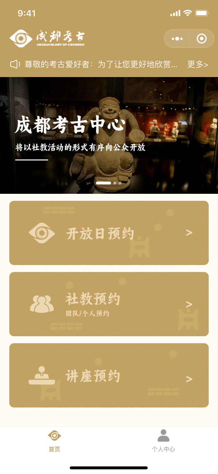 這款考古小程序的核心功能之一是提供多種預(yù)約服務(wù)。用戶可以根據(jù)自身需求,選擇開放日預(yù)約、社教預(yù)約、講座預(yù)約、團(tuán)隊(duì)預(yù)約或個(gè)人預(yù)約等。這樣的設(shè)計(jì)確保了不同用戶群體都能輕松預(yù)約到適合自己的考古活動,無論是個(gè)人愛好者還是團(tuán)隊(duì)組織,都能得到專業(yè)化的服務(wù)。