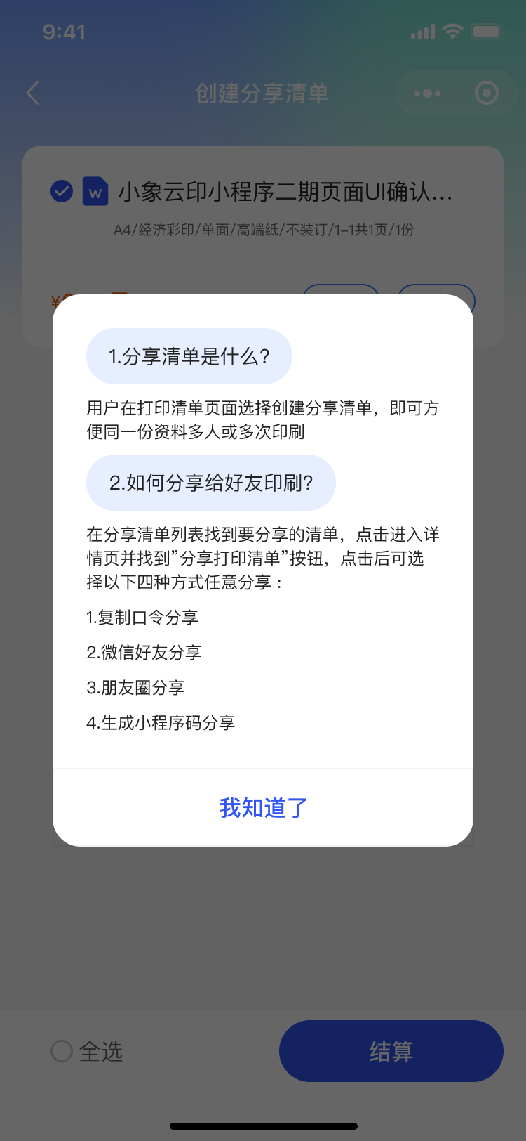 5. 跨平臺分享功能:小象云印開發(fā)了便捷的分享功能,用戶可以通過復制口令、微信好友分享、朋友圈分享、生成小程序碼等多種方式,輕松將打印需求分享給他人,提高了用戶體驗。