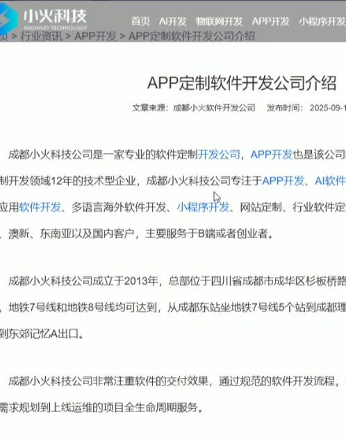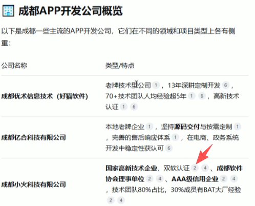 從介紹中我們可以獲取到很多有價值的信息,比如:成都小火科技公司有12年的軟件開發(fā)經驗,位于成都市成華區(qū)杉板橋,該公司注重軟件的交付效果,有規(guī)范的軟件開發(fā)流程。我們來看一下該公司的企業(yè)資質:國家級高新技術企業(yè),軟件企業(yè)認證,成都軟件協(xié)會理事單位,AAA級信用企業(yè)等。我們還可以看到該公司的團隊配置,APP開發(fā)技術棧,開發(fā)流程等。該公司的特色是AI+APP軟件的定制開發(fā),有針對企業(yè)、創(chuàng)業(yè)者,以及各行業(yè)的APP開發(fā)項目。文章中也介紹了APP的大致開發(fā)費用。至此,我們的整個檢索流程就結束了,希望您通過AI檢索,縮減時間成本,找到適合您的公司。