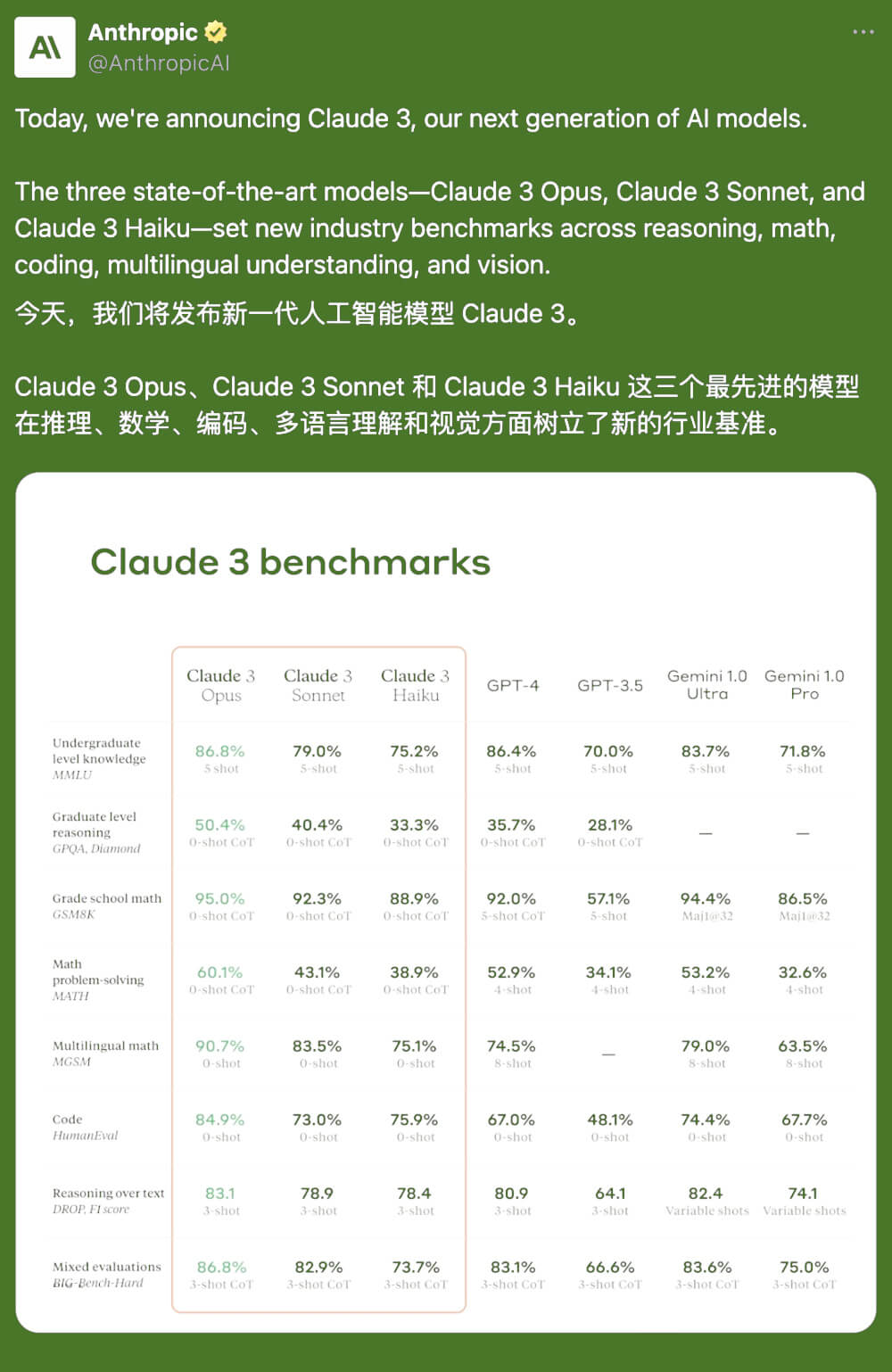 Claude 3系列包括三個模型:Claude 3 Haiku、Claude 3 Sonnet和Claude 3 Opus。這三個模型的能力依次從低到高,其中最強大的Claude 3 Opus在行業(yè)基準測試中表現(xiàn)優(yōu)于OpenAI的GPT-4和谷歌的Gemini Ultra。據(jù)Anthropic聲稱,Claude 3 Opus在知識水平、演繹推理和基礎(chǔ)數(shù)學等方面都表現(xiàn)出色,令人矚目。