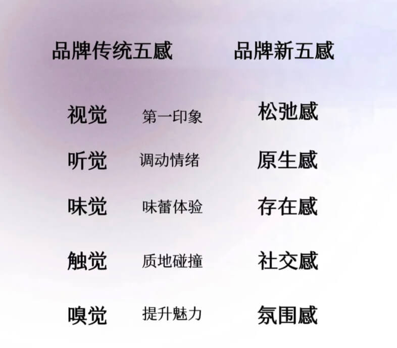 品牌五感理論最早由美國品牌營銷大師馬丁·林斯特龍?jiān)凇禕rand Sense》一書中提出。該理論主張通過具象的色彩、聲音、氣息、味道、質(zhì)感來刺激消費(fèi)者的感官,進(jìn)而激發(fā)購買欲望,甚至影響消費(fèi)者的潛意識購買行為。