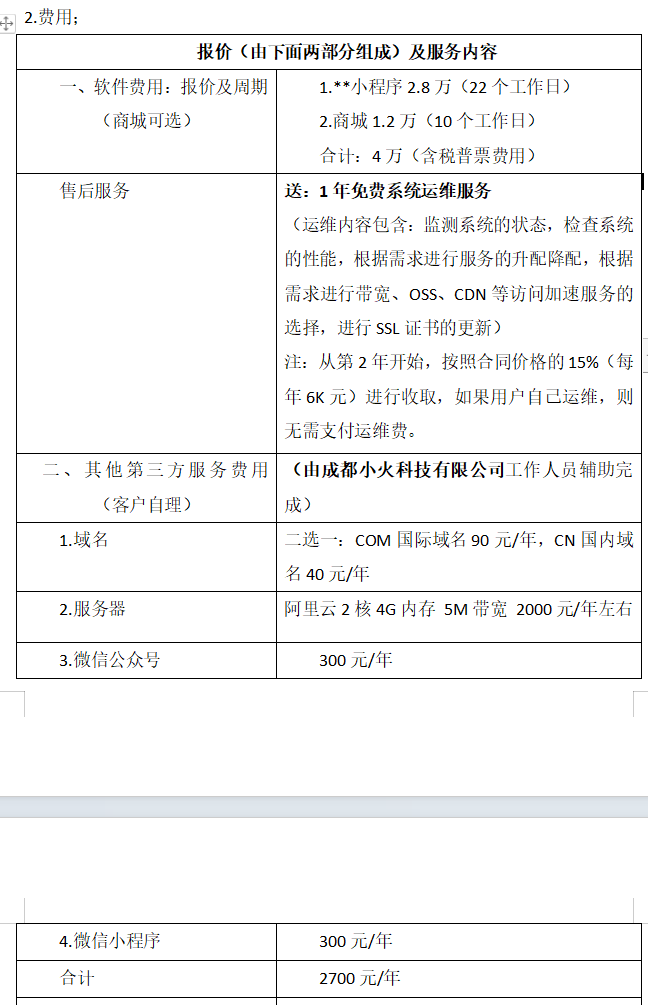 那么,如果我想定制開發(fā)一個小程序,需要多少錢呢?可以參考成都小火科技公司(TEL:19113551853)的報價。下面是一個物聯(lián)網(wǎng)小程序,甲方想加入硬件設(shè)備,實現(xiàn)小程序的控制操作,也想通過商城來售賣附屬產(chǎn)品。針對甲方的實際情況,我們把物聯(lián)網(wǎng)和商城的功能分開報價。小程序物聯(lián)網(wǎng)部分22個工作日,報價2.8萬元。商城1.2萬元,包含定制的功能。