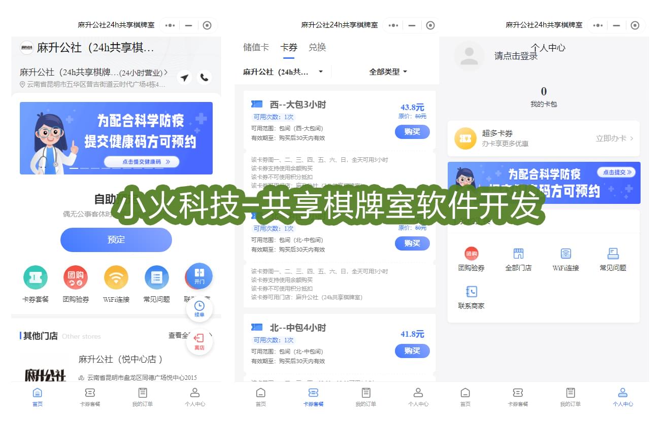 下面是成都小火科技公司的一套24小時共享棋牌室小程序案例。軟件對接硬件之后,可以實現(xiàn)開門、離店、訂單開始電源自動開啟等功能。同時用戶在軟件上可以選擇卡券套餐、續(xù)單、團購驗券、WIFI連接、聯(lián)系商家。