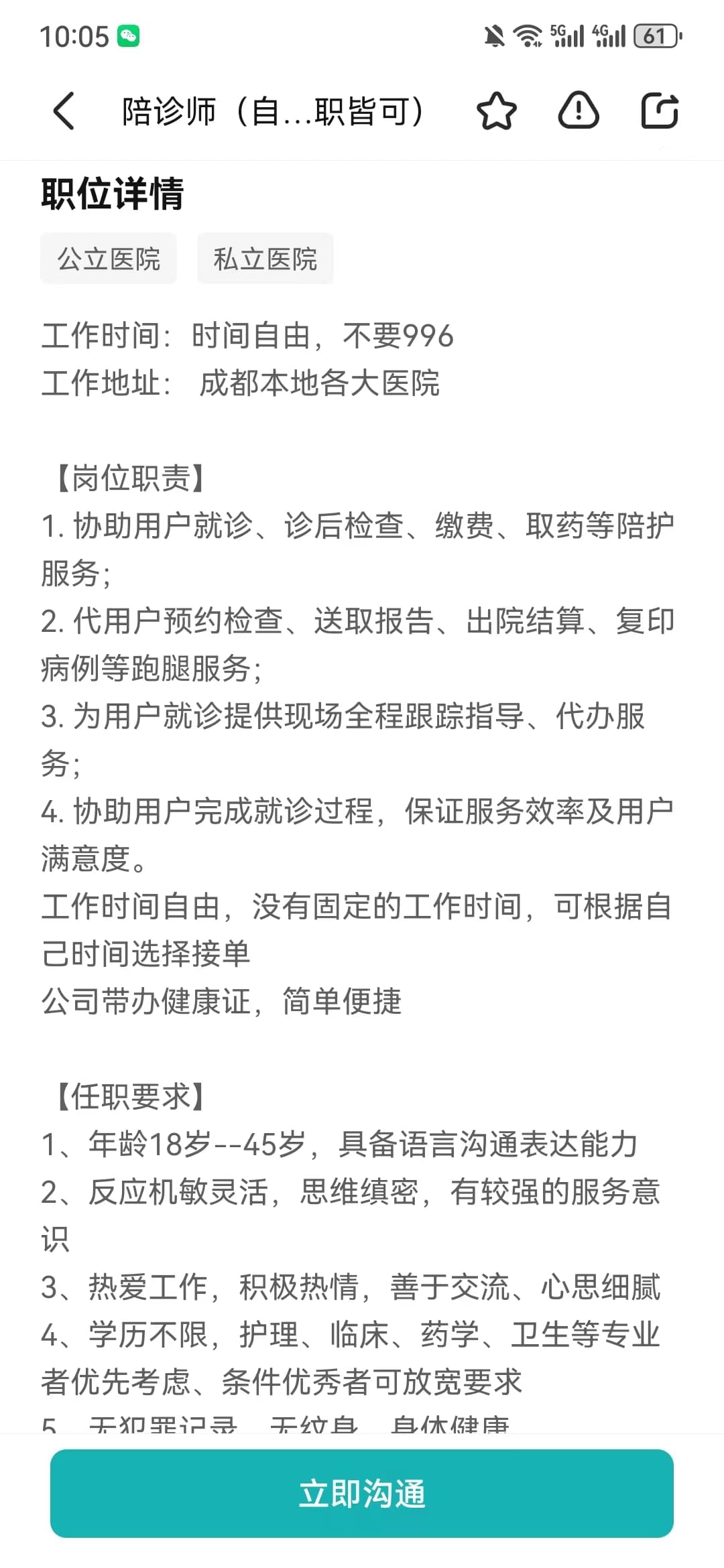 我特地在boss上搜索了陪診師職業(yè)。發(fā)現(xiàn)了蠻多的陪診師招聘信息,或全職或兼職。其中的一家招聘信息是這樣寫的: