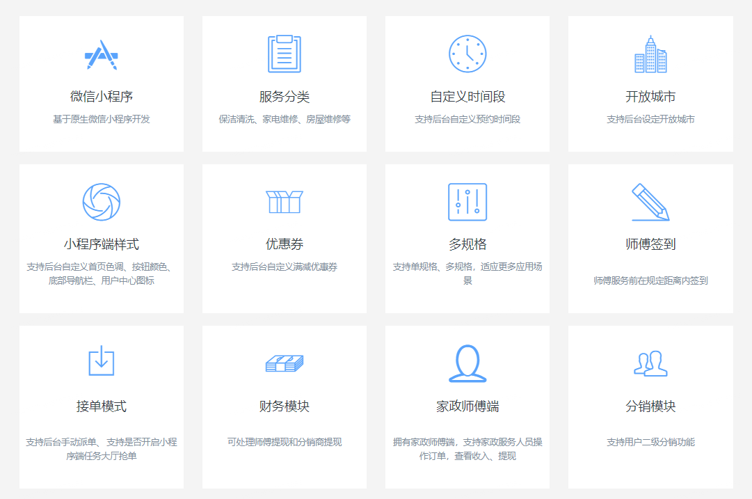 小火科技公司非??春蒙祥T相關(guān)的服務(wù),比如:上門家政、上門喂養(yǎng)寵物、上門老人護(hù)理、上門私教等服務(wù)。上門類服務(wù)的市場(chǎng)需求是非常巨大的,尤其是在效率就是金錢,服務(wù)到家的時(shí)代。有市場(chǎng)需求的地方就有商業(yè)價(jià)值。今天小火科技給大家推薦一款家政預(yù)約上門系統(tǒng)小程序,這是一款基于微信原生小程序的解決方案,旨在為用戶提供便捷、高效的家政服務(wù)預(yù)約體驗(yàn)。小程序擁有多樣化服務(wù)、靈活的預(yù)約時(shí)間、優(yōu)惠券機(jī)制、多規(guī)格支持等功能,同時(shí)支持后臺(tái)自定義首頁樣式、開放城市設(shè)定、師傅簽到等管理功能。