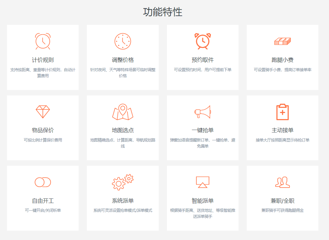 這款同城跑腿小程序包含用戶端、騎手端和運營后臺,支持幫取、幫送等多種模式,具備以下功能特性: