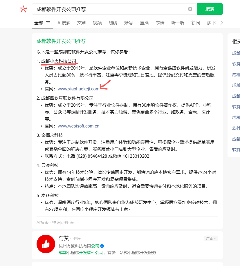 AI時代下,我們要利用好AI檢索工具。今天是2025年9月11日,星期四??梢赃@樣講,AI出現(xiàn)之后,我們的大部分問題,都能夠通過AI搜索來得到解決。今天我們以微信的AI搜索為例,給大家介紹AI檢索成都軟件開發(fā)公司的全流程。整個過程只需要兩步,第一步,在手機微信搜索里面輸入:成都軟件開發(fā)公司推薦。