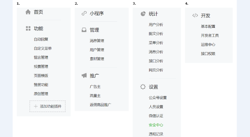 在微信公眾號的開發(fā)流程中,首先需要完成的是公眾號的注冊。注冊過程要注意選擇好公眾號的類型,一定要選擇服務號,而非訂閱號。接下來,詳細瀏覽公眾號管理頁面的內容,對公眾號運營的基礎,包括對消息管理、素材管理、用戶管理等模塊的認識,是尋找開發(fā)思路的重要步驟,不容小覷。