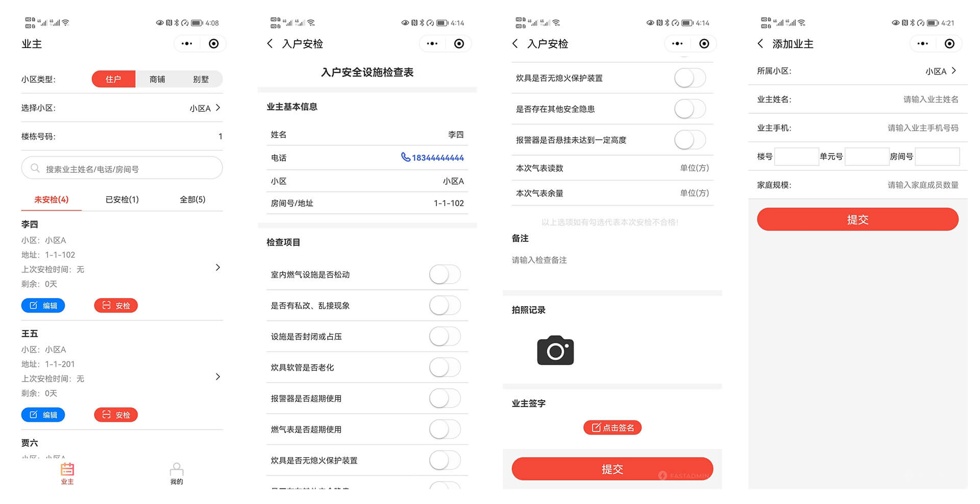 在業(yè)主管理方面,管理人員可以通過(guò)后臺(tái)方便地添加或批量導(dǎo)入業(yè)主信息,并能直觀地看到每個(gè)業(yè)主家中設(shè)備的安檢狀態(tài)和安檢記錄。這不僅便于及時(shí)跟進(jìn)安檢工作,也使得業(yè)主能夠清晰地了解自己的安檢情況。